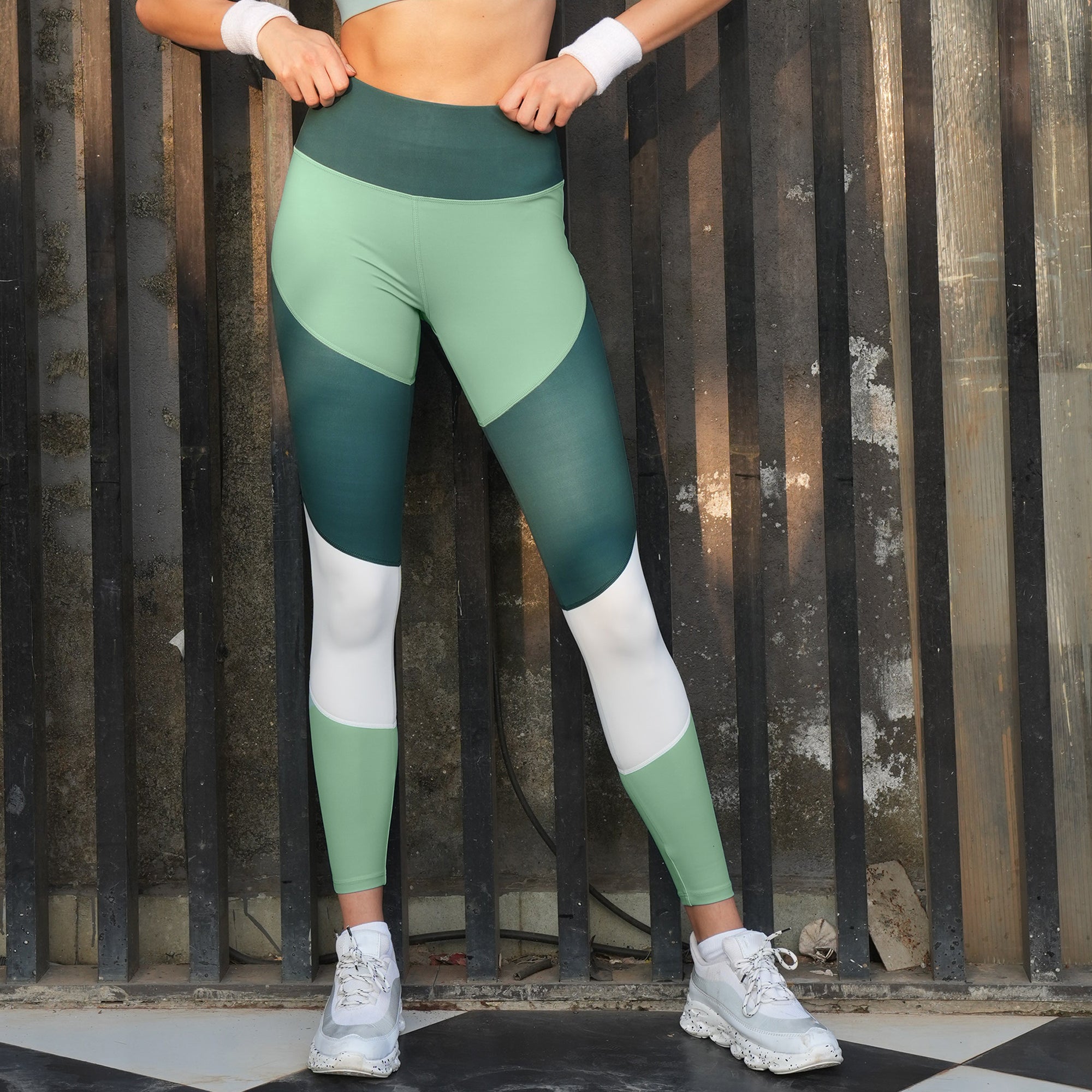 High-Waist Compression Waistband Ankle-Length Leggings with Tri-Color Block